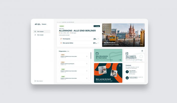 Client Envol Espace Type de projet Création de projet Description Envol Espace est une agence spécialisée dans l’organisation de voyages scolaires sur mesure depuis 1984. Elle propose un catalogue de plus de 300 séjours éducatifs modulables à travers la France, l’Europe et le monde, adaptés aux élèves de l’école primaire au supérieur. Outils Adobe XD Asana Miro Contexte Envol Espace avait pour but de créer de nouveaux outils pour les enseignants afin de faciliter la gestion et le suivi des voyages, ainsi que d’automatiser les échanges entre Envol Espace et les professeurs. Réalisation Création d’un nouveau parcours utilisateur pour les enseignants Création du parcours utilisateurs back-office Maquettages UX Conception UI