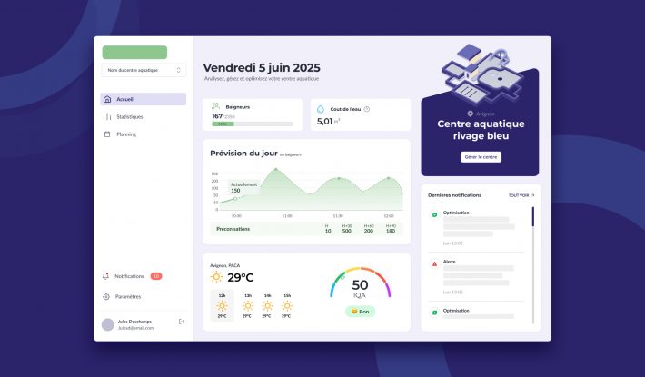 Client Hi!EcoConso Type de projet Création de projet Description Hi!EcoConso est une solution innovante d’optimisation énergétique destinée aux piscines publiques et centres aquatiquesLa plateforme utilise l’intelligence artificielle pour permettre aux collectivités de reprendre le contrôle de leurs consommations énergétiques et de se conformer aux exigences du décret tertiaire. Outils Figma URL – Contexte général Le défi : Concevoir une application web complète sans base existante pour rendre accessible des données énergétiques complexes auprès de gestionnaires d’équipements municipaux. Mon rôle : En tant que UX/UI Designer, j’ai pris en charge l’intégralité de la conception, construisant l’expérience utilisateur de A à Z et établissant les fondations de l’architecture d’information, des parcours utilisateurs et du système de design. Vision et objectifs stratégiques Comprende les besoins réels et cas d'usages Pour démarrer ce projet sans base existante, j’ai mené une phase de découverte approfondie visant à comprendre l’environnement complexe des gestionnaires d’équipements aquatiques. En collaboration avec le Product Owner, nous avons identifié les principales problématiques terrain : la difficulté de maîtriser les consommations énergétiques, le manque de visibilité sur les données en temps réel et la pression réglementaire du décret tertiaire. Cette phase exploratoire a révélé des cas d’usage critiques tels que l’anticipation des pics de consommation, l’optimisation des plages horaires et la génération de rapports de conformité Identifier les utilisateurs et leurs attentes Les personas ont été co-élaborés avec le Product Owner, dont l’expertise métier a permis d’identifier trois profils distincts d’utilisateurs. Le premier archetype représente le responsable technique qui intervient quotidiennement sur les équipements et recherche des alertes claires et actionnables. Le deuxième persona incarne le directeur de centre aquatique qui nécessite une vision globale des performances énergétiques et des tableaux de bord synthétiques pour la prise de décision. Le troisième profil correspond au responsable énergie de la collectivité qui doit produire des rapports de conformité réglementaire et suivre les objectifs de réduction. Chaque persona intègre ses motivations spécifiques, ses frustrations avec les outils existants et ses attentes vis-à-vis d’une solution d’optimisation intelligente. Prioriser les fonctionnalités clés du MVP L’approche MVP était essentielle pour ce projet greenfield afin de valider rapidement les hypothèses auprès des utilisateurs. J’ai organisé des ateliers de priorisation avec l’équipe pour hiérarchiser les fonctionnalités selon leur valeur utilisateur et leur faisabilité technique. Les fonctionnalités prioritaires retenues incluent le tableau de bord de monitoring en temps réel des consommations, le système d’alertes prédictives basé sur l’IA, et le module de génération de rapports de conformité au décret tertiaire. Cette priorisation rigoureuse a garanti que la première version réponde aux besoins essentiels tout en posant les bases d’une architecture évolutive. Poser les bases de la première version de l'outil La conception de l’architecture de l’information constituait un défi majeur étant donné la complexité des données énergétiques à rendre accessibles. J’ai structuré l’interface autour de trois espaces principaux : un espace de monitoring pour la visualisation des consommations en temps réel, un espace d’analyse pour identifier les opportunités d’optimisation, et un espace de pilotage pour ajuster les paramètres des équipements (mais qui serait pas faisable techniquement en début de projet). Les wireframes basse-fidélité ont permis de tester précocement la navigation et la hiérarchie des informations avec des utilisateurs pilotes. Cette phase itérative a abouti à la création d’un système de design cohérent facilitant la scalabilité future de la plateforme Aligner tous les acteurs sur la même vision J’ai établi une collaboration continue avec l’équipe de développement pour garantir l’alignement entre vision UX et contraintes techniques. Les validations précoces des maquettes ont permis d’anticiper les défis d’intégration hardware avec les équipements aquatiques et d’assurer la faisabilité du développement software. Cette synchronisation régulière a réduit considérablement les aller-retours et permis de respecter les deadlines de livraison tout en maintenant la qualité de l’expérience utilisateur.